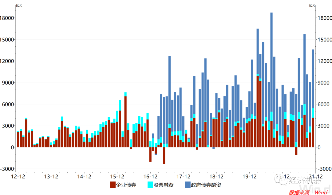 4)新增社會(huì)融資總額中,政府債券融資和企業(yè)債券融資是同比多增的主要拉動(dòng)項(xiàng)。11月新增社會(huì)融資總額2.61萬(wàn)億元,同比多增4745億元。其中,政府債券融資新增8158億元,同比多增4158億元,企業(yè)債券融資新增4104億元,同比多增3264億元,是新增社會(huì)融資同比多增的主要拉動(dòng)因素。
