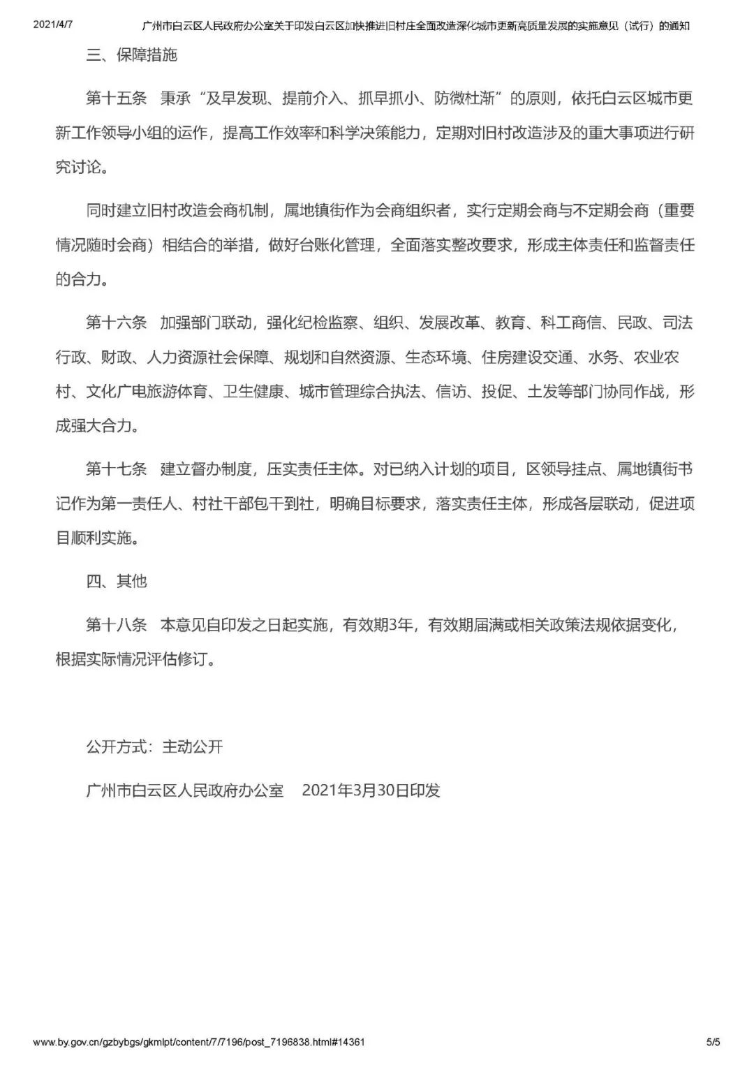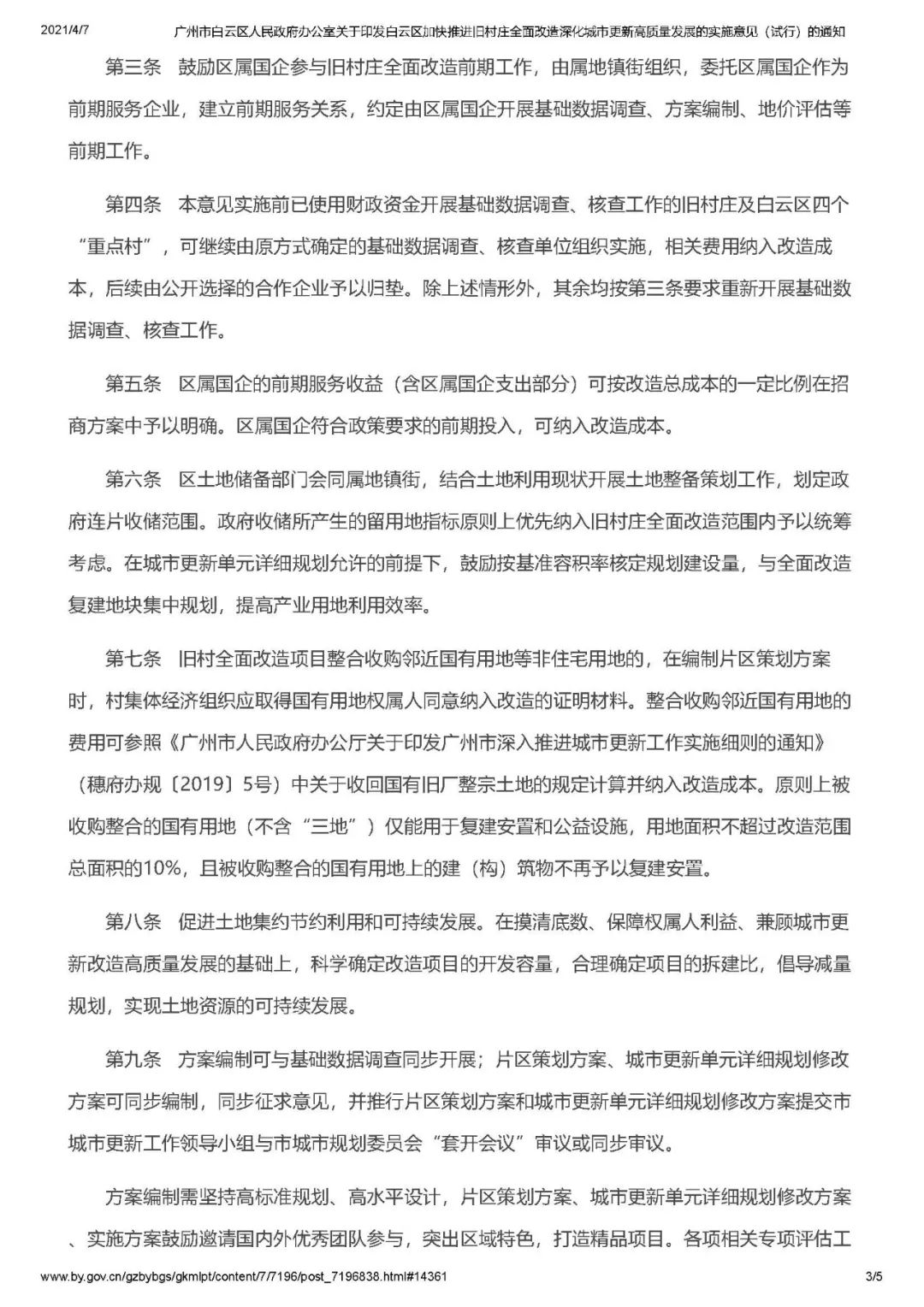 政策明確規定鼓勵區屬國企參與舊村莊全面改造前期工作。根據白云區舊改新政第三條規定,白云區后續舊村莊全面改造鼓勵區屬國企參與前期工作,與此前的《征求意見稿》相比,刪除了“重點區域”的相關表述,且舊改新政第十條規定意愿表決、實施方案表決由屬地鎮街牽頭組織開展表決。