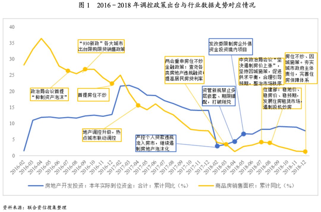 自2016年下半年開始,房地產行業銷售數據與需求端的調控政策緊密相關,隨著調控的頻繁出臺銷售數據呈明顯下滑且自2018年開始持續地位徘徊;房地產開發投資本年實際到位資金與融資端/個人貸款端政策關聯度高,2018年初開始呈現斷崖式下滑,具體政策時點與行業數據走勢對應情況如圖1所示,第一波行業加壓正式來臨。