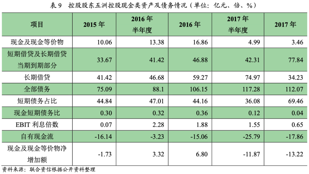 2018年7月5日,五洲控股已發生債務違約,控股股東雖然為五洲國際債務提供擔保,但自身收入下滑,盈利虧損,經營活動現金流量凈額持續為負,自身償債能力不足,對五洲國際債務已無擔保能力。