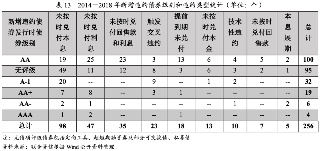 各年份違約主體違約前信用評級呈現明顯的遷移態勢,2014年違約主體的信用評級較低,或無信用評級,隨后違約主體信用級別逐漸升高和分散化,直至2017年,級別最高的違約債券違約前主體信用評級提高至AA+,2018年,幾乎各個級別都出現了違約情況。