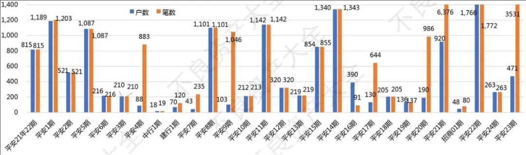 其中,中國銀行2022年第1期戶數最少,可謂袖珍資產,僅有18戶。第二少的平安銀行2022年第7期也有43戶,是前者的兩倍多。平安銀行的資產戶數普遍比較多,28期中戶數最多的為平安2022年第22期,共1,766戶。