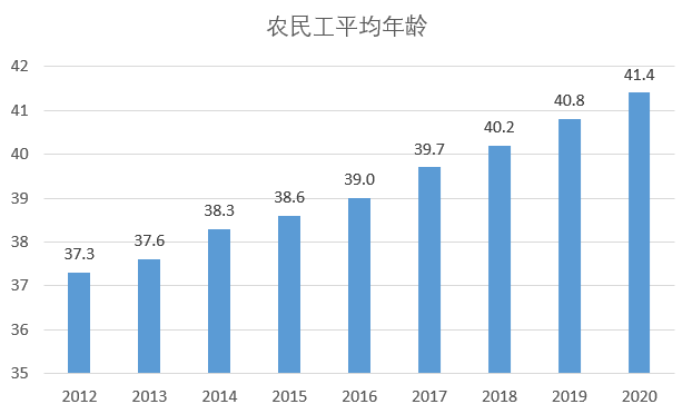 10年前的農(nóng)民工平均年齡為37.3歲,而到了2020年,農(nóng)民工的平均年齡已經(jīng)上升到了41.4歲,且呈現(xiàn)出年齡加速上升的趨勢(shì)。