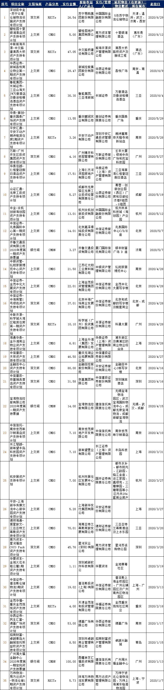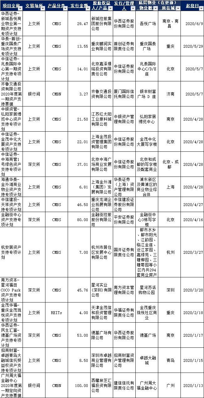 2020年1月1日至2020年6月30日,國內已發(fā)行CMBS(含CMBN、下同)/類REITs產(chǎn)品35單,總規(guī)模815.44億元(不含儲架規(guī)模),其中類REITs產(chǎn)品6只、CMBS產(chǎn)品29只(含CMBN3只)。其中以購物中心/商場為底層資產(chǎn)的CMBS/類REITs產(chǎn)品25只。標的物業(yè)分布以上海/北京居多及其他強二線城市為主。