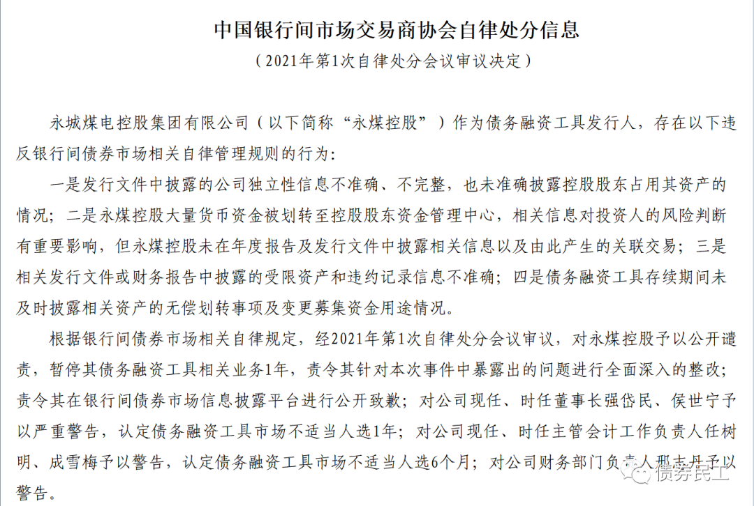 2020年11月10日,永煤集團電發行的“20永煤SCP003”意外違約,在信用債券市場上引發了極大的關注。永煤集團及相關中介機構相繼收到了監管機構的處分。在上海證券交易所的此次紀律處分之前的2021年1月14日,交易商協會對永煤集團予以公開譴責,暫停其債務融資工具相關業務1年。