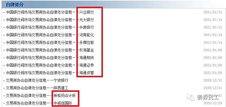 永煤集團債券違約之后,不止讓永煤集團和河南能化被交易商協會的嚴厲處分,引發了交易商協會對1家會計師事務所(希格瑪會計師事務所)、1家評級機構(中誠信評級)、7家金融機構(海通證券、海通期貨、海通證券資管、東?;?、興業銀行、光大銀行、中原銀行)的自律處分。這么大的自律處分力度在信用債券歷史上絕無僅有,康美藥業和康得新等影響較大的違約發行人也沒有這個待遇。打開交易商協會的自律處分頁面,直接被永煤事件的相關機構自律處分情況刷屏。