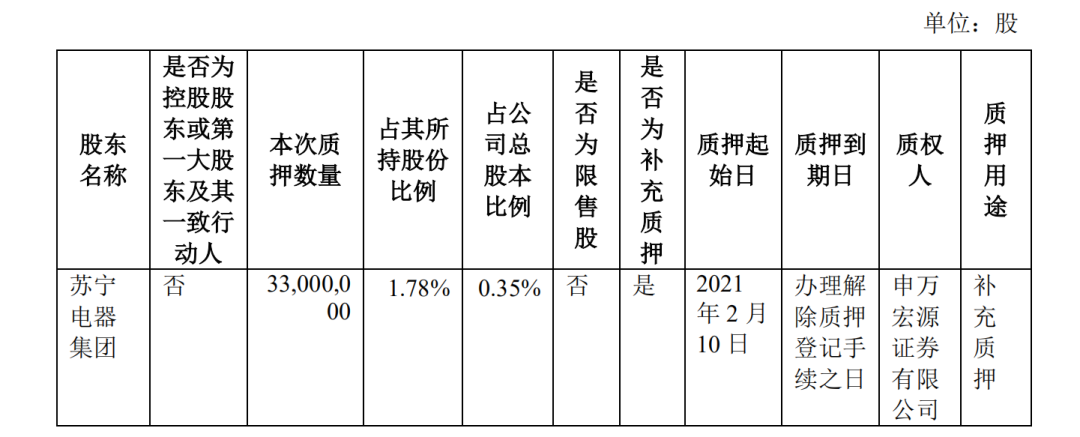 公司近日接到公司持股5%以上股東蘇寧電器集團有限公司通知,蘇寧電器集團所持有的3300萬股股份向申萬宏源辦理了質押,占公司總股本的0.35%,質押起始日為2月10日,用途為補充質押。