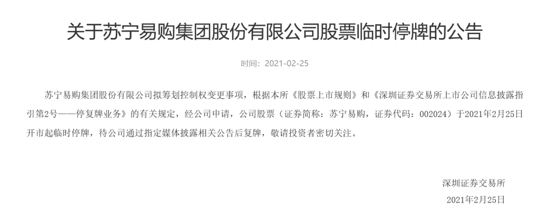 今早,據深交所披露,蘇寧易購集團股份有限公司擬籌劃控制權變更事項,經公司申請,公司股票于2021年2月25日開市起臨時停牌,待公司通過指定媒體披露相關公告后復牌。