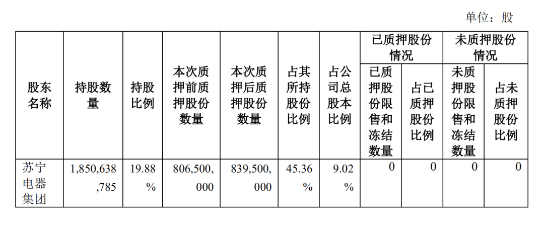 本次質押后,蘇寧電器集團累計質押約8.4億股公司股份,占公司總股本的9.02%。
