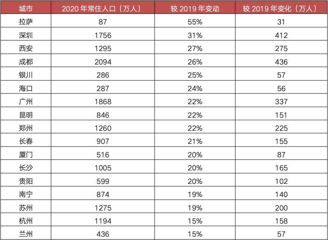 其中較2019年人口變化比較大的深圳位于前列。按照“七普”人口數據,2020年常住人口較2019年增加412萬人,增長達31%。