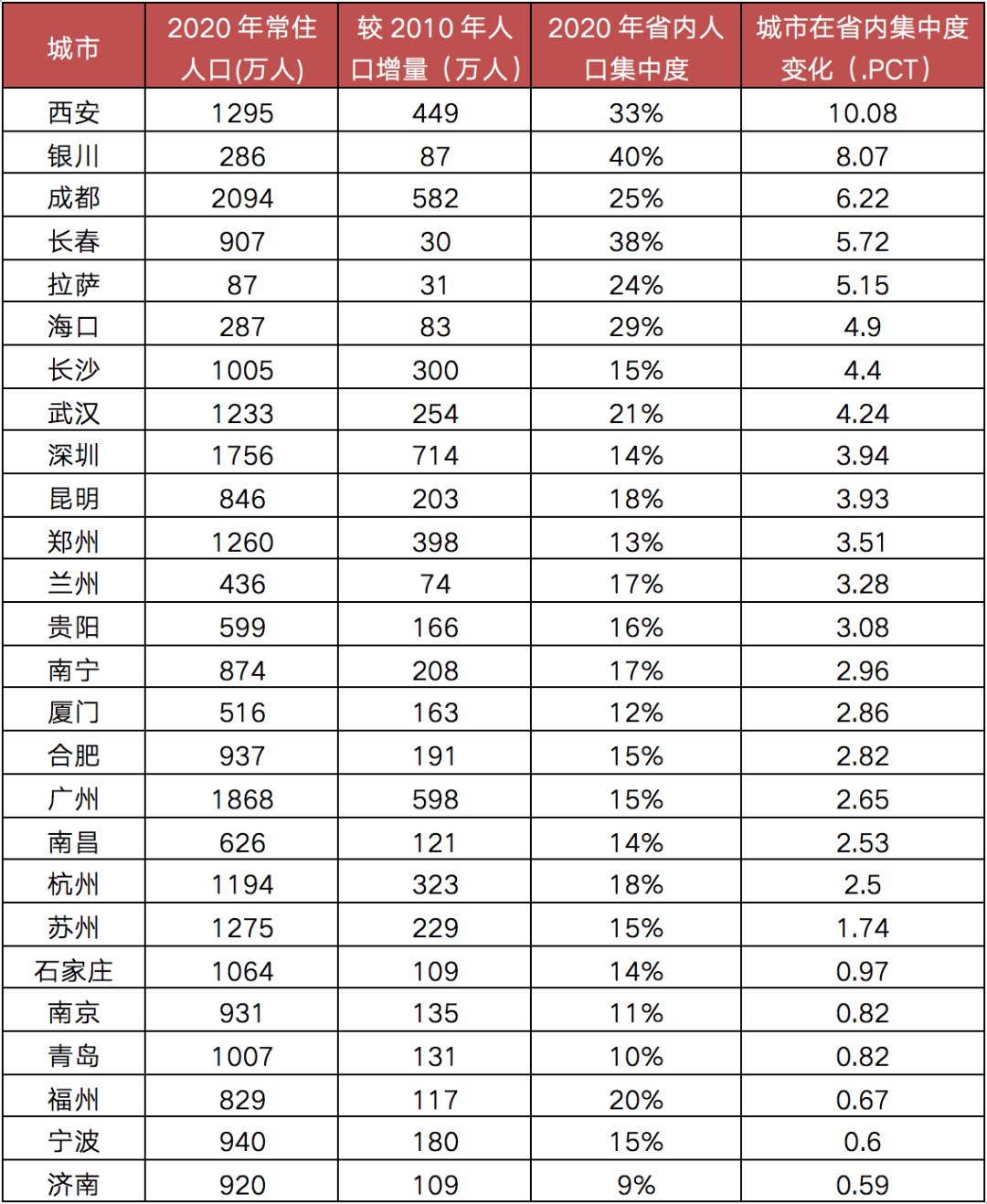 此外,中西部核心城市集中度提升較為明顯,典型如西安,“七普”常住人口達1295萬人,占陜西全省人口占比達33%,較10年前增加了10.08個百分點,無論是省會城市人口集中度,還是集中度增幅,均在全國處于前列。銀川、成都、拉薩、長沙、武漢等也比較突出,人口集中度增幅均超過4個百分點,以成都為例,10年間常住人口增量達582萬,成為除北京、上海和重慶三個直轄市之外,第四個常住人口突破2000萬人的超大城市。