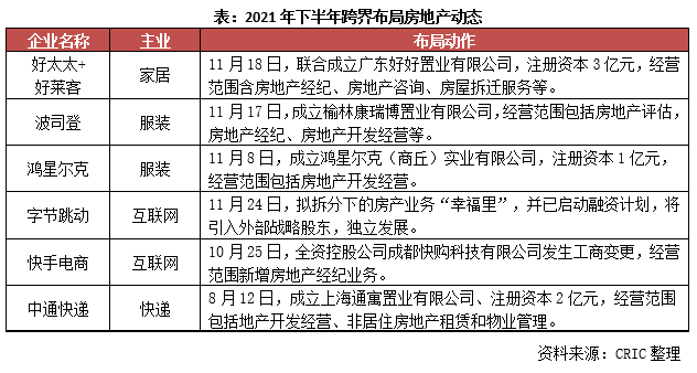 告別高增長、高盈利時代,當前房地產行業進入低增長和強調控期,風險積聚,顯然已經過了進駐熱潮期,不再是其他行業跨界的最優選。但是今年下半年以來,字節跳動、快手電商、鴻星爾克、波司登、中通快遞等企業仍不懼市場寒意,通過拆分、成立子公司的形式逆勢布局。