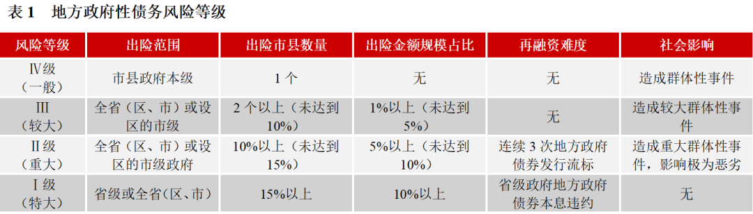 根據(jù)88號文,按照政府性債務風險事件的性質、影響范圍和危害程度等情況,劃分為Ⅰ級(特大)、Ⅱ級(重大)、Ⅲ級(較大)、Ⅳ級(一般)四個等級,其中,事件性質包括本息實質性違約、因兌付政府債務本息導致無法保障必要的基本民生支出和政府有效運轉支出、地方政府債券流標和地方政府債券實質性違約。本文將具體量化指標分為出險范圍、出險市縣數(shù)量、出險金額規(guī)模、再融資難度、社會影響五個方面來。分級處置機制是動態(tài)的、日常的,當政府性債務風險事件等級隨時間推移有所上升時,按照升級后的級別處置,同時,分級處置將推動政府加強日常流動性管理,避免出現(xiàn)因流動性管理不善導致政府性債務違約,觸發(fā)財政重整條件。