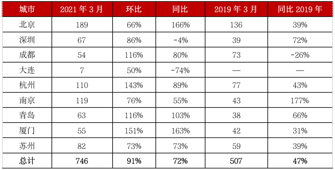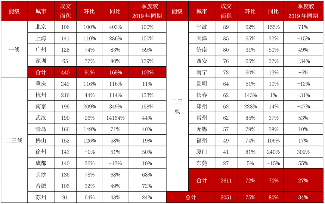 3月,28個典型城市商品住宅成預(yù)計成交規(guī)模將達(dá)3051萬平方米,同、環(huán)比分別增80%和75%。整體而言,一季度較2019年同期增長34%,一線城市繼續(xù)領(lǐng)漲,二三線城市分化特點(diǎn)逐漸體現(xiàn)。