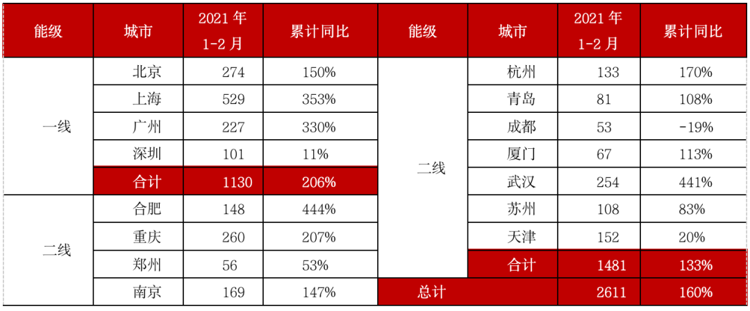而受去年同期基數(shù)較低、各城市分化加劇等方面影響,二線城市成交面積為1481萬平方米,同比增長133%。其中合肥和武漢前2月成交量增至148萬平方米和254萬平方米,同比翻4倍以上,15城中僅成都二手房成交同比為負(fù)。