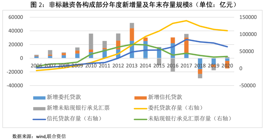 [8]人民銀行公布的非標融資規(guī)模存量數(shù)據(jù)也是始于2015年,此前數(shù)據(jù)為聯(lián)合資信根據(jù)各年增量數(shù)據(jù)推算??赡苡捎诳趶阶兓?,導(dǎo)致由此推算而得的2006、2007兩年的委托貸款存量為負值。