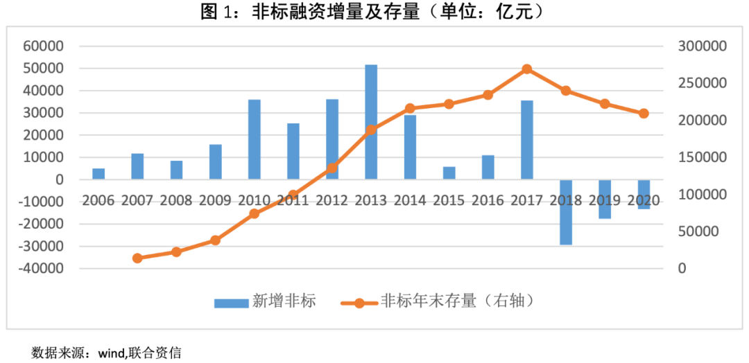 現(xiàn)有統(tǒng)計數(shù)據(jù)中,完整的非標融資新增量月度數(shù)據(jù)開始于2006年1月至今[4],存量數(shù)據(jù)從2015年3月末開始發(fā)布[5]。以此宏觀數(shù)據(jù)為基礎(chǔ),我們可以觀察到:2006—2009年,是非標的初步發(fā)展時期,每年新增量在1萬億左右。2010—2014年為快速發(fā)展階段,每年新增量都在2萬億元以上,最高的2013年新增達5萬億元以上;2015—2017年進入緩慢增長期,新增量逐年增加,2017年達到本階段最高;2017年政策開始去杠桿,整頓影子銀行和理財,非標融資開始轉(zhuǎn)為收縮,2018年大幅收縮2.9萬億元,以后收縮幅度逐年收窄。存量上看,也是于2017年達到最高的26.9萬億元,隨后進入收縮趨勢,2020年非標融資存量為20.9萬億元,三年之間收縮了6萬億元。