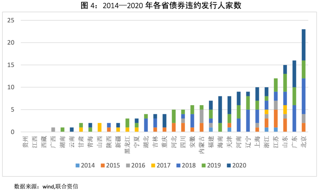 2014年以來各地區(qū)債券市場違約發(fā)行人數(shù)量的增加情況,與其非標融資收縮之間呈現(xiàn)出較為明顯的相關(guān)性。如北京市非標融資規(guī)模收縮最大,相應(yīng)地債券違約數(shù)量最多,2014—2020年7年間北京共有24家發(fā)行人債券違約,非標融資大幅收縮的2018年和2020年,新增違約發(fā)人數(shù)明顯增多;廣東、山東等債券違約較多的地區(qū),其非標融資規(guī)模也處于收縮之中,廣東債券發(fā)行人違約全部集中在2018—2020年非標融資大幅收縮時期;非標融資規(guī)模收縮幅度較大的遼寧、天津、湖北、上海等地區(qū),債券發(fā)行人違約數(shù)量在近年來均增加較多。值得注意的是,江西、貴州、西藏三省至今沒有發(fā)生債券違約,除西藏自身特殊情況外,貴州的非標融資規(guī)模實際上是增加的,江西在2019年和2020年非標融資有所收縮,但2018—2020年三年總計收縮規(guī)模較小。以上情況說明,地區(qū)非標融資規(guī)模的收縮程度對其債券信用風(fēng)險具有較為明顯的沖擊,隨著各地非標融資的進一步收縮,債券市場違約風(fēng)險將承受較大壓力。信用風(fēng)險影響方面,主要是對信托貸款、委托貸款依賴性強,缺少其他融資渠道的融資人,現(xiàn)金流趨于緊張,面臨較大信用風(fēng)險,這樣的融資人主要集中在房地產(chǎn)開發(fā)企業(yè)及低資質(zhì)地方國有企業(yè)(城投及產(chǎn)業(yè)企業(yè))群體中。