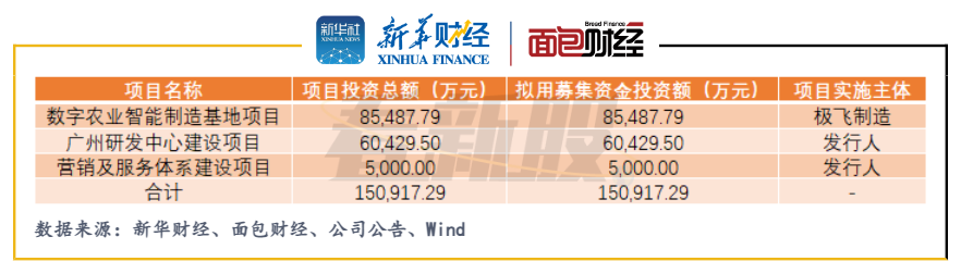 極飛科技此次擬公開發行普通股不超過6001萬股,約占公司發行后總股本的15%,募資金額約15.09億元,主要用于數字農業智能制造基地項目、廣州研發中心建設項目、營銷及服務體系建設項目。