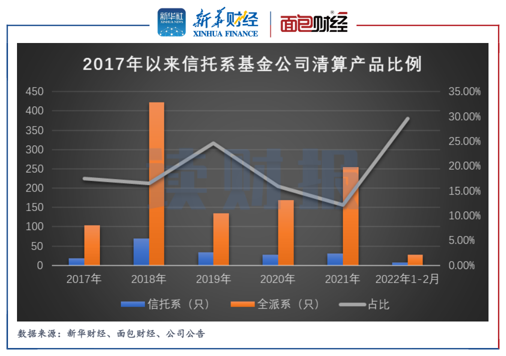 整體來看,2017-2021年信托系基金公司的179只公募產品被清盤,約占同期市場總清盤數量的17%。從每年的清算比例來看,除2019年比例約達25%,其余年份清算比例均在15%左右。進入2022年,該比例顯著上升,截至2022年2月末該比例已接近30%。