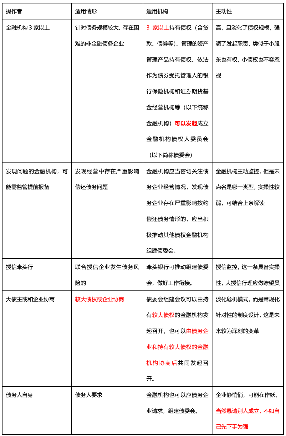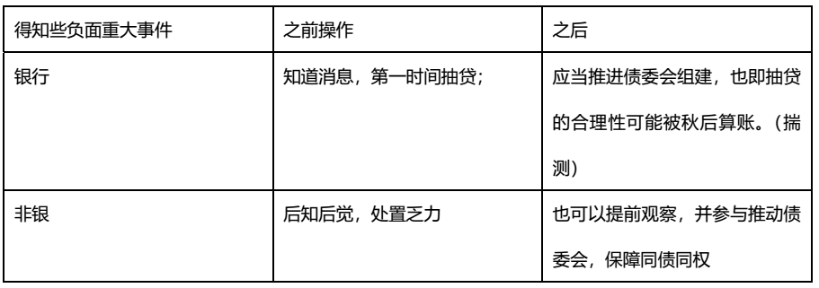 一句應(yīng)當(dāng),應(yīng)當(dāng),是風(fēng)險(xiǎn)防范的意識(shí)要求,也是監(jiān)管對于粗放式金融管理的精細(xì)化進(jìn)階要求,因而后續(xù)可能債委會(huì)更為時(shí)髦,不一定是此前的已經(jīng)到難以為繼的狀態(tài)才設(shè)立。
