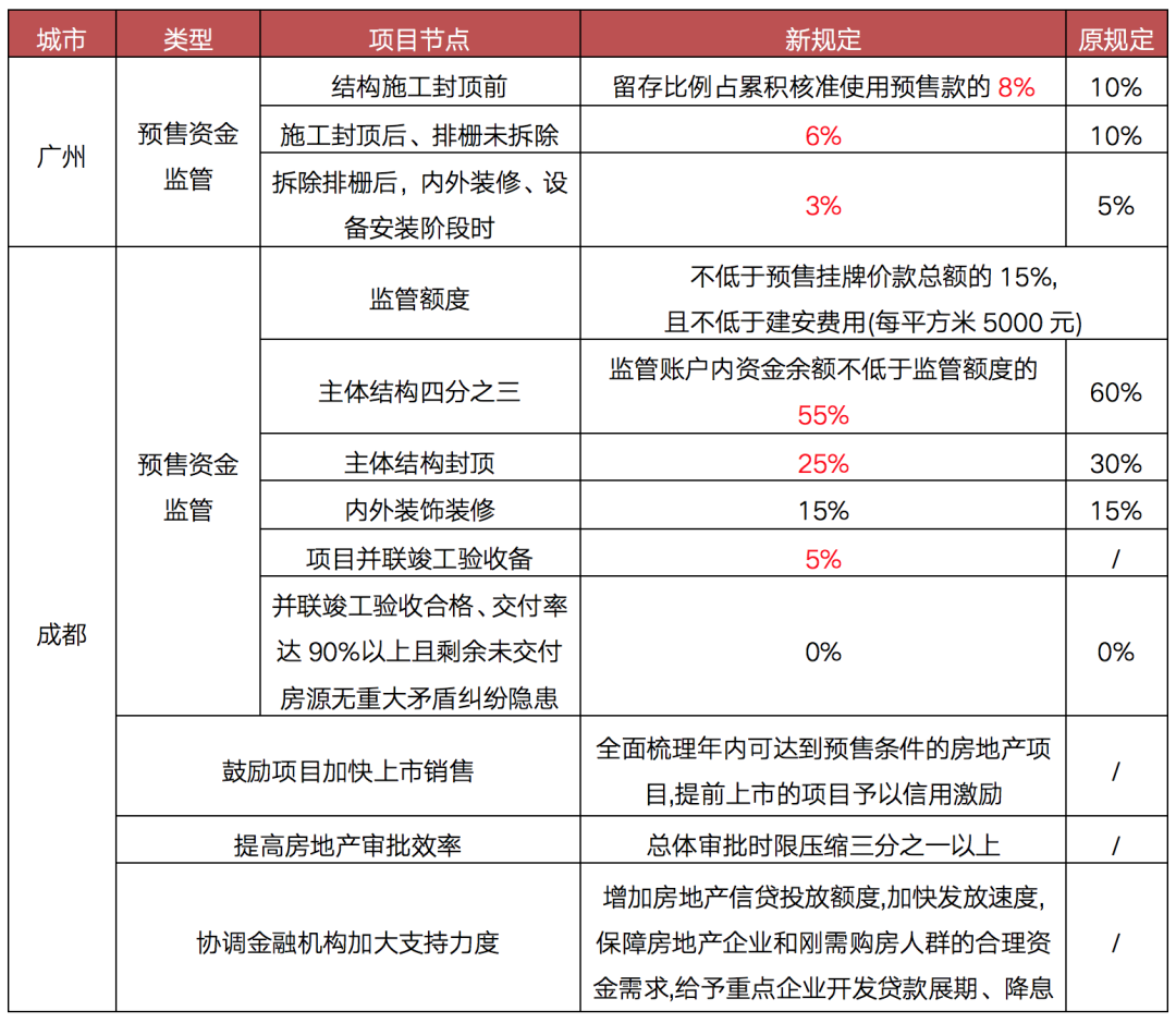 放松對預售資金的監管,調低處于不同工程進度的留存比例,是兩大城市政策的共同特征。