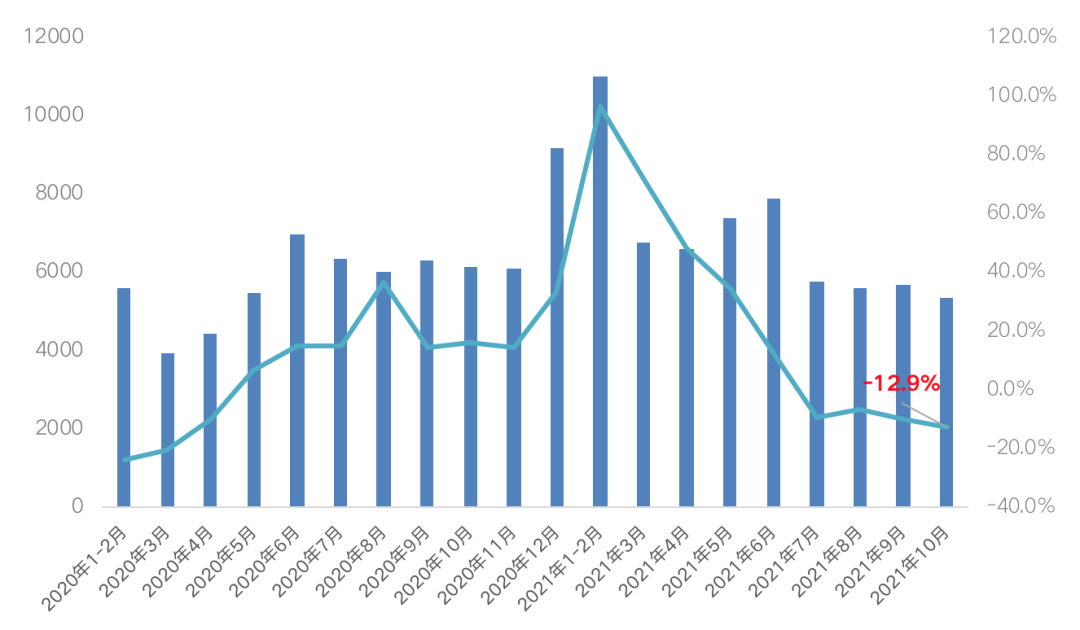 不過目前來看,定金與預收款月度同比增速正在持續走低,2021年10月,定金及預收款新增5351億元,同比下降12.9%,已降至年內低位。