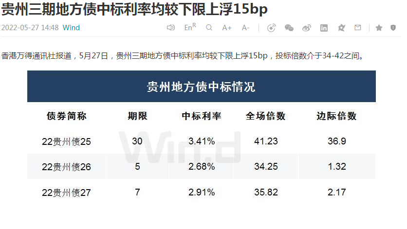 無獨有偶,5月27日,貴州三期地方債中標利率均較下限上浮15bp,投標倍數(shù)介于34-42之間。數(shù)據(jù)顯示,22貴州債25/26/27(對應期限30/5/7)的全場認購倍數(shù)為41.23/34.25/35.82。
