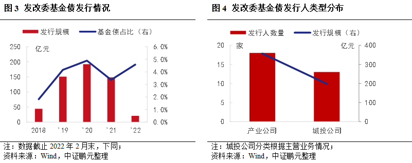 2018年后基金債發行規模出現快速上升,2020年達到191.90億元,隨后出現下降。整體看,2018年-2022年2月,共發行基金債47只,發行規模555.10億元,涉及31家發行人。基金債在企業債的占比較低,2020年為4.9%。2022年經濟下行壓力加大,企業再融資難度上升,基金債發行占比提升至4.6%。