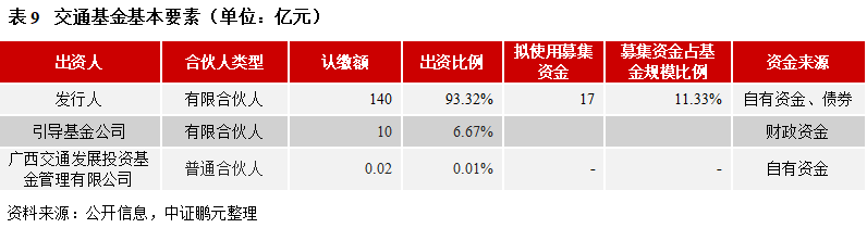 交通基金,2019年由發行人作為主發起人設立的有限合伙制基金,總體規模150億元,由廣西自治區財政廳安排 10 億元,注資廣西投資引導基金有限責任公司,代表自治區財政廳履行出資人義務。剩余資金由廣西交投集團通過增信籌資、社會化募集等方式籌集。發行人子公司廣西交通發展投資基金管理有限公司為基金管理人。交通基金存續期30年,根據經營需要,可延長。基金投向省內高速公路、鐵路等項目,投資方式主要以母子基金形式進行,以股權形式投資到項目企業的資金作為項目資本金,或帶動金融機構通過貸款等債權方式出資到項目企業。2020年公司收到廣西投資引導基金有限公司投資資金 8.83 億元,用于出資交通基金相關子基金。