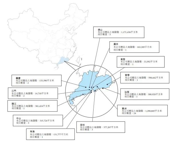 招股書介紹,主要在粵港澳大灣區(qū),截至8月末45個(gè)項(xiàng)目組合,覆蓋廣東省12個(gè)城市,其中4個(gè)項(xiàng)目通過一家聯(lián)營(yíng)公司開發(fā)。