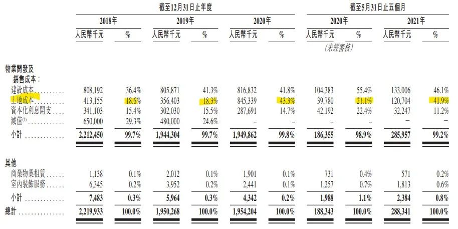 有趣的是,方直發(fā)展的物業(yè)開發(fā)及銷售成本中,土地成本占比波動(dòng)比較大。