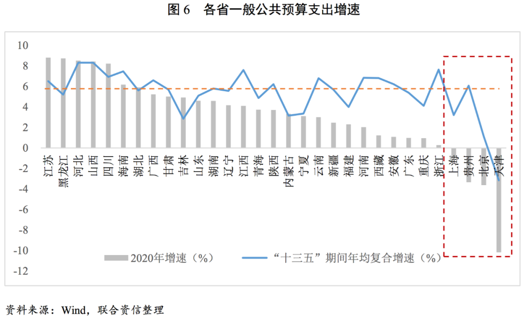 2020年大部分省份一般公共預算支出維持擴張態勢,但增速普遍低于“十三五”期間年均復合增速,支出增速呈下降態勢。2020年,一般公共預算支出增速中位數為3.71%,其中除了天津(-10.18%)、北京(-3.63%)、貴州(-3.35%)和上海(-0.94%)的一般公共預算支出同比下降外,其余省份均呈增長態勢?!笆濉币巹澠陂g,各省一般公共預算支出年均復合增速中位數為5.69%,五年間呈現前高后低格局,主要系各地區貫徹執行優化財政支出結構,樹立過緊日子的思想,嚴格壓縮一般性支出,加大對重點領域支持力度,提高資金配置效率等精神指示[2],壓減不必要的財政支出,帶動2019年以來各省一般公共預算支出增速多成下降態勢,以積極應對經濟增速換擋、收支矛盾突顯等問題。