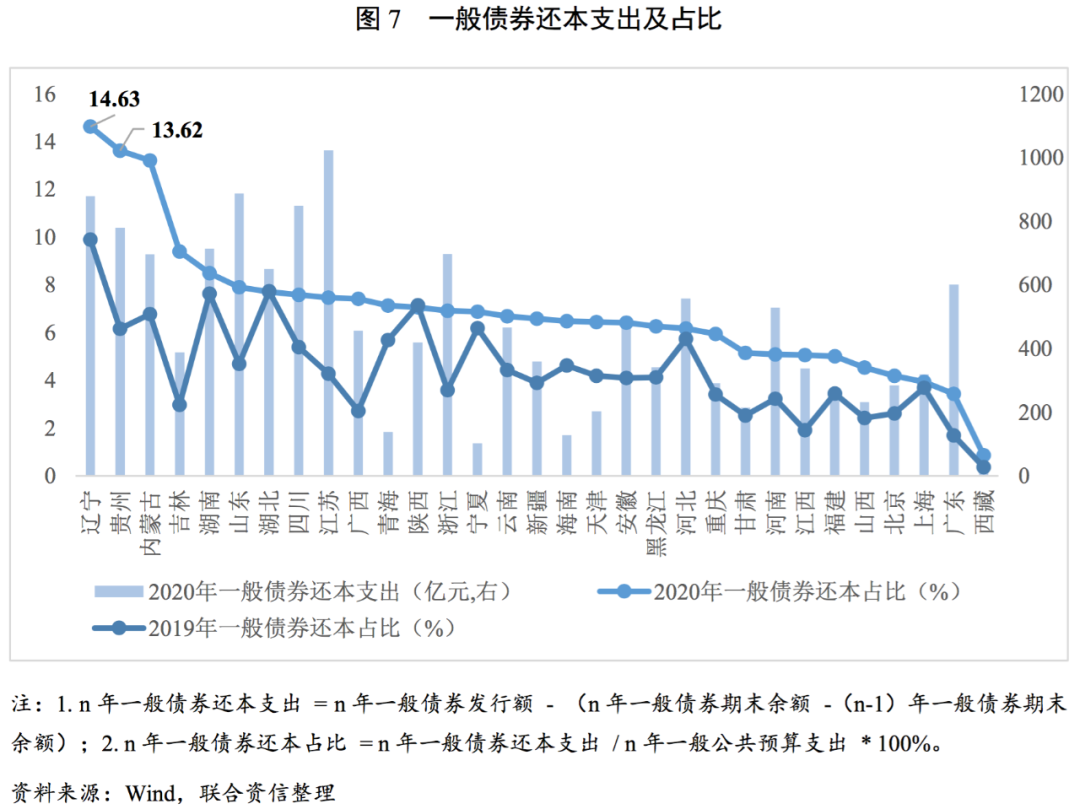 2020年,各省一般公共預算支出持續擴張,各項支出中一般債券本金支出的占比集中于5~8%,較2019年進一步提高。2020年是全面實行地方政府債發行以來第一個集中兌付年份,隨著未來各地債券集中到期,各省地方政府債還本支出占比將進一步提升,對其他公共財政支出項形成一定制約。