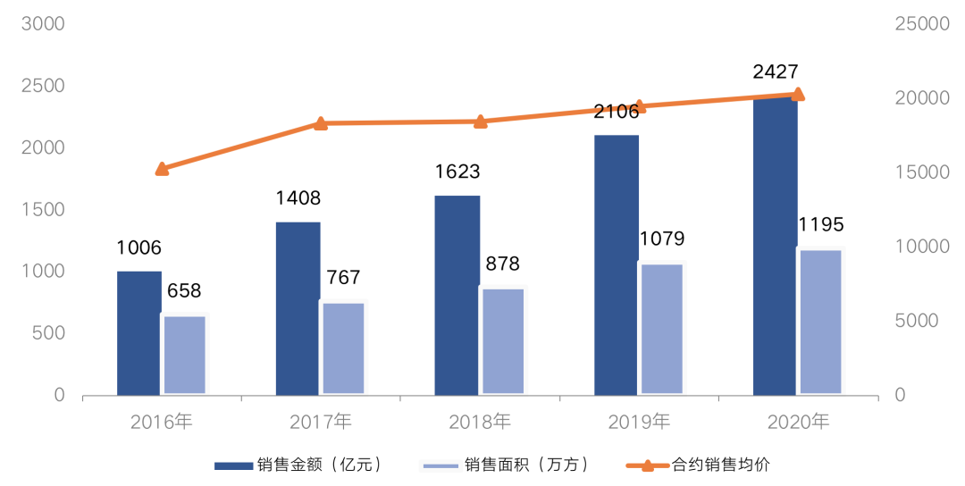 2020年金地集團業績量價齊升,全年實現合約銷售金額2426.8億元,銷售面積1194.8萬平方米,分別同比增長15.2%和10.7%。
