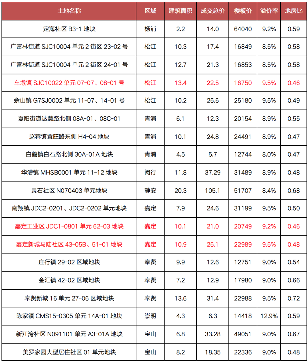 表:上海首輪集中供地中典型地塊地房比