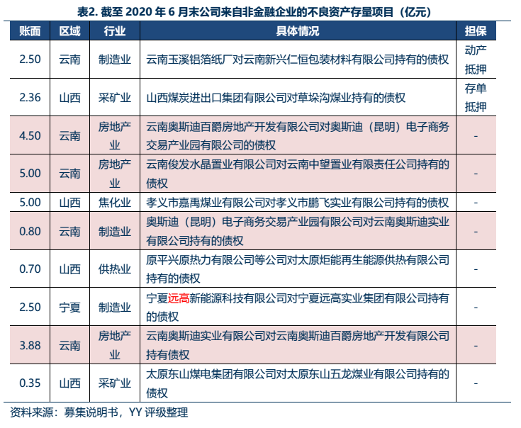 不良資產底層債務人來看,存量非金融項目主要涉及采礦業、制造業和房地產業,其中8個項目的底層債務人為民企;約48%投向了房地產業;區域分布于山西、云南和寧夏地區,云南地區占比60%。