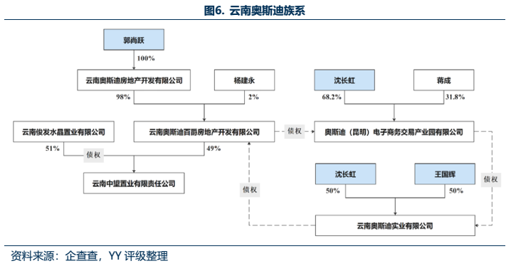 比如5個云南的項目中,有4個項目(見上表標紅處)均圍繞云南奧斯迪實業有限公司存在股權、高管上的各種聯系。奧斯迪實業是浙江臺州仙居人沈長虹和王國輝在上世紀90年代共同來到昆明做服裝生意之后,于2000年創辦的,關聯企業20多家,目前經營領域包括服裝業、房地產開發、商業物業運營、電商等,位于云南省非公企業第40強。沈長虹擔任了云南省人大代表、昆明市人大常委等職務,奧斯迪百爵房地產的實控人郭尚躍擔任云南省浙江商會常務副會長。值得注意的是,這兩人名下還有一家P2P公司(昆明市盤龍區浙信小額貸款股份有限公司,沈長虹持股30%為最大股東,郭尚躍持股10%)。