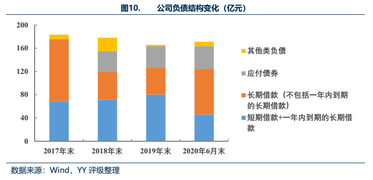 考慮到公司高杠桿經營的特性,截至2020年6月末,公司資本負債率為78.87%,小幅下降。有息負債包括銀行長期借款、母公司和銀行的短期借款、債券融資,其中短期借款33.50億元,長期借款89.91億元,債券融資46.00億元。期限結構上看,2017-2019年債務有短期化的趨勢,短期債務占比較高。