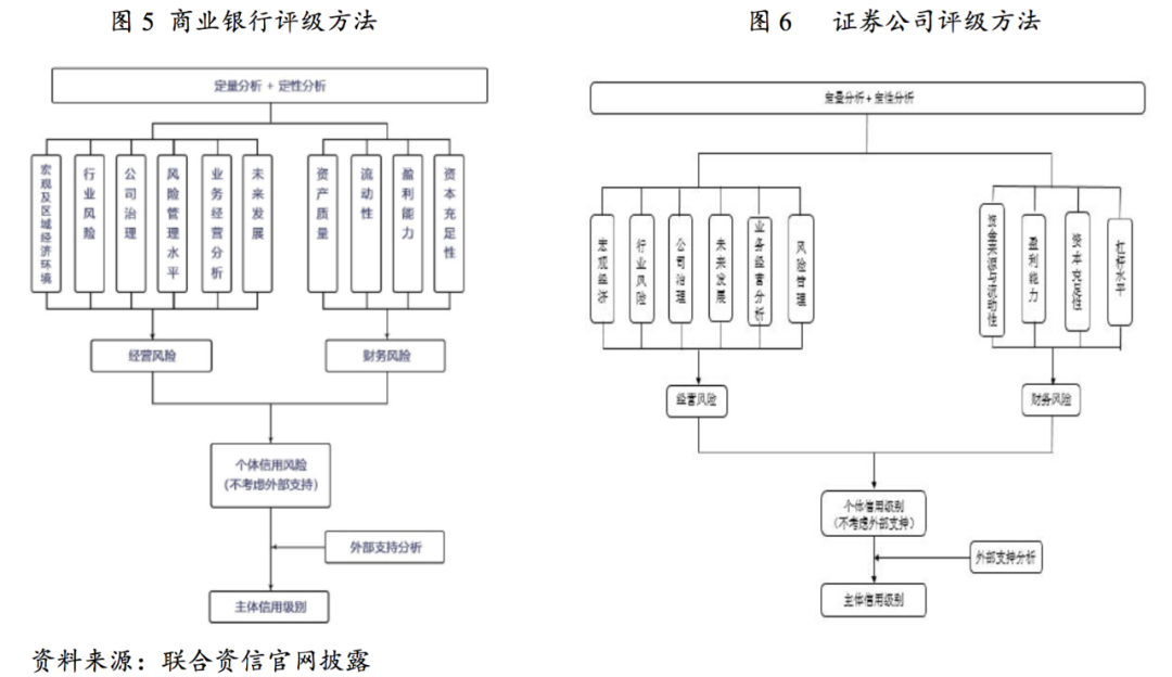 根據(jù)聯(lián)合資信官網(wǎng)披露的商業(yè)銀行和證券公司評(píng)級(jí)方法都是以定量結(jié)合定性分析,經(jīng)營(yíng)風(fēng)險(xiǎn)和財(cái)務(wù)風(fēng)險(xiǎn)矩陣的形式得到該行業(yè)自身個(gè)體信用等級(jí),再通過(guò)外部支持分析得到主體信用等級(jí)。經(jīng)營(yíng)風(fēng)險(xiǎn)方面,商業(yè)銀行面臨宏觀和區(qū)域風(fēng)險(xiǎn)、行業(yè)風(fēng)險(xiǎn)、公司治理水平、風(fēng)險(xiǎn)管理水平、業(yè)務(wù)經(jīng)營(yíng)狀況、未來(lái)發(fā)展能力將影響銀行的信用風(fēng)險(xiǎn);通常情況下面臨的宏觀和區(qū)域風(fēng)險(xiǎn)越低、行業(yè)風(fēng)險(xiǎn)越低、公司治理及風(fēng)險(xiǎn)管理能力越強(qiáng)、業(yè)務(wù)經(jīng)營(yíng)情況越好、未來(lái)發(fā)展能力越好的銀行,其經(jīng)營(yíng)風(fēng)險(xiǎn)越低。財(cái)務(wù)風(fēng)險(xiǎn)方面,銀行自身的資產(chǎn)質(zhì)量、資本結(jié)構(gòu)、盈利能力、流動(dòng)性水平將影響銀行的信用風(fēng)險(xiǎn);通常情況下,資產(chǎn)質(zhì)量較高、資本充足、盈利能力較強(qiáng)、流動(dòng)性水平較好的銀行,其財(cái)務(wù)風(fēng)險(xiǎn)較低。