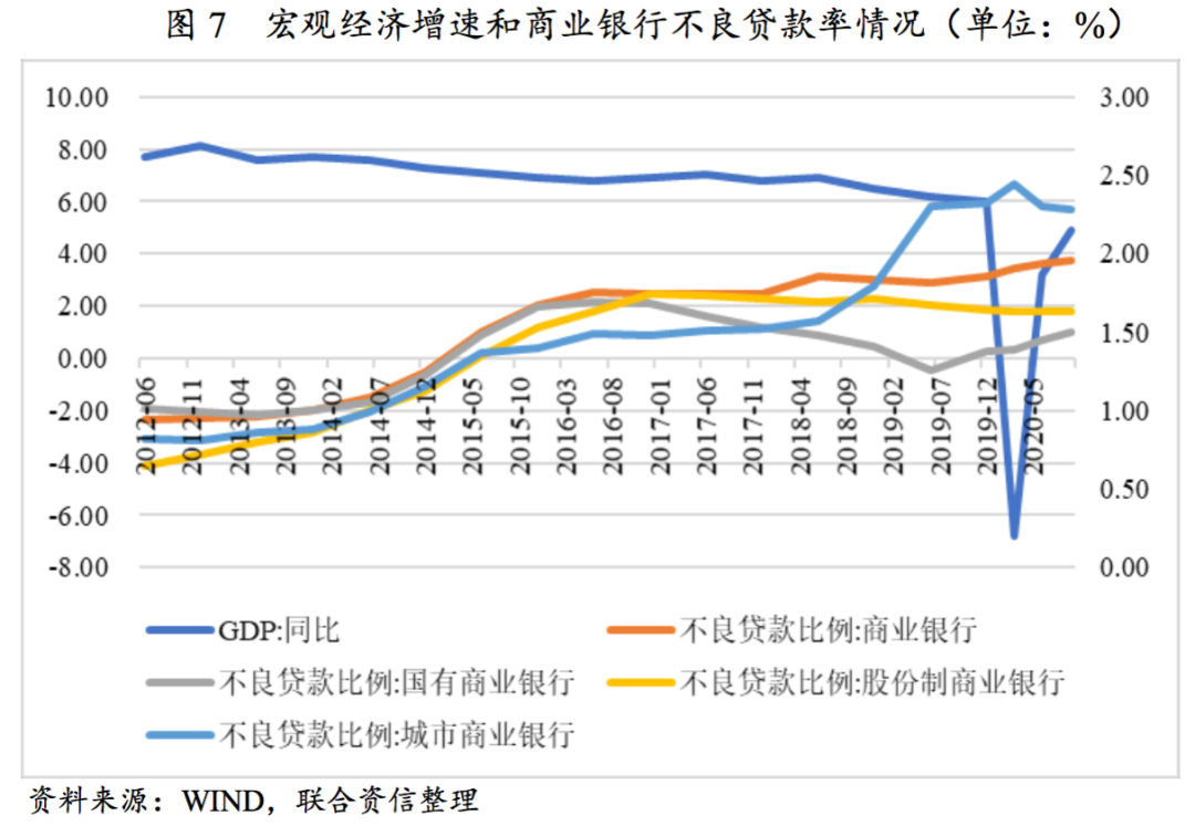 我們選取了宏觀經(jīng)濟(jì)增速與商業(yè)銀行不良貸款率對(duì)比,明顯發(fā)現(xiàn)宏觀經(jīng)濟(jì)增速與商業(yè)銀行不良貸款率為負(fù)相關(guān),宏觀經(jīng)濟(jì)越好,商業(yè)銀行不良貸款率越低。2012-2014年宏觀經(jīng)濟(jì)增速達(dá)7%以上,整體商業(yè)銀行不良貸款率約1.00%左右,但隨著2015年宏觀經(jīng)濟(jì)增速的逐步放緩,商業(yè)銀行不良貸款率也逐步開(kāi)始攀升。截至2015年末,GDP增速為6.90%,商業(yè)銀行不良貸款率增至1.67%。2016-2019年,宏觀經(jīng)濟(jì)增速持續(xù)下行,截至2019年末商業(yè)銀行不良貸款率攀升至1.86%,其中農(nóng)商行主要屬地經(jīng)營(yíng)為主,區(qū)域經(jīng)濟(jì)環(huán)境差異化較大,不良貸款率攀升至2.32%。2020年一季度受新冠疫情影響,GDP增速為-6.80%,雖第二、三季度有所回升,但未來(lái)商業(yè)銀行整體資產(chǎn)質(zhì)量仍承壓。