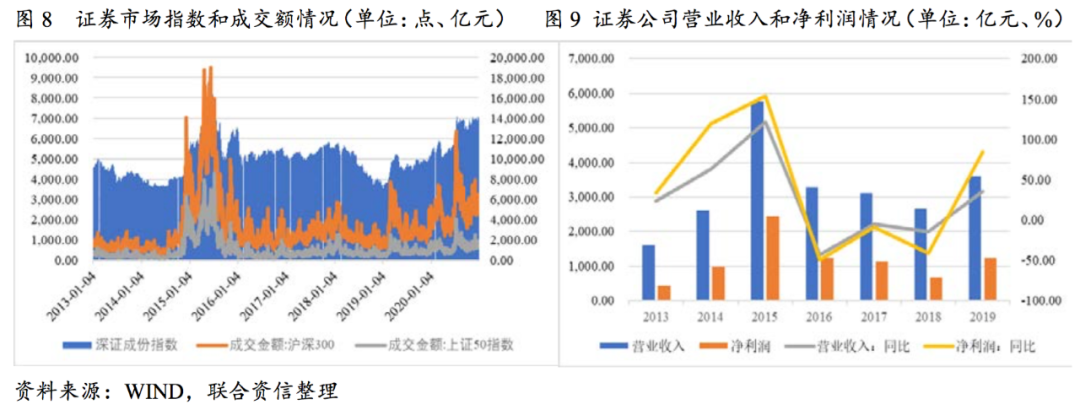 證券公司經(jīng)營(yíng)表現(xiàn)與證券市場(chǎng)關(guān)系緊密,隨著市場(chǎng)下行和成交量的低迷,全行業(yè)證券公司營(yíng)業(yè)收入和凈利潤(rùn)自2015年開(kāi)始連續(xù)三年下滑;2016-2018年,全行業(yè)證券公司營(yíng)業(yè)收入均有所下滑,三年同比下滑42.97%、5.08%和14.47%,凈利潤(rùn)分別同比下滑49.57%、8.47%和41.04%。2019年證券市場(chǎng)交易額的回升證券公司全年實(shí)現(xiàn)營(yíng)業(yè)收入3604.83億元,凈利潤(rùn)1230.95億元,分別較2018年增長(zhǎng)35.37%和84.77%。