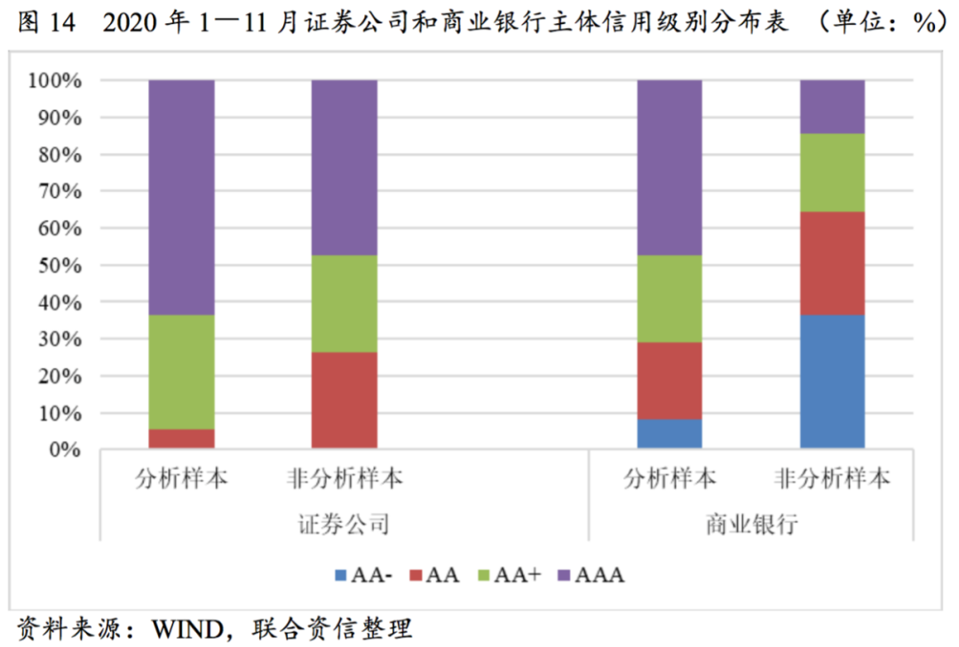 商業(yè)銀行信用級(jí)別分布較廣,證券公司高信用級(jí)別發(fā)債占比高于商業(yè)銀行。