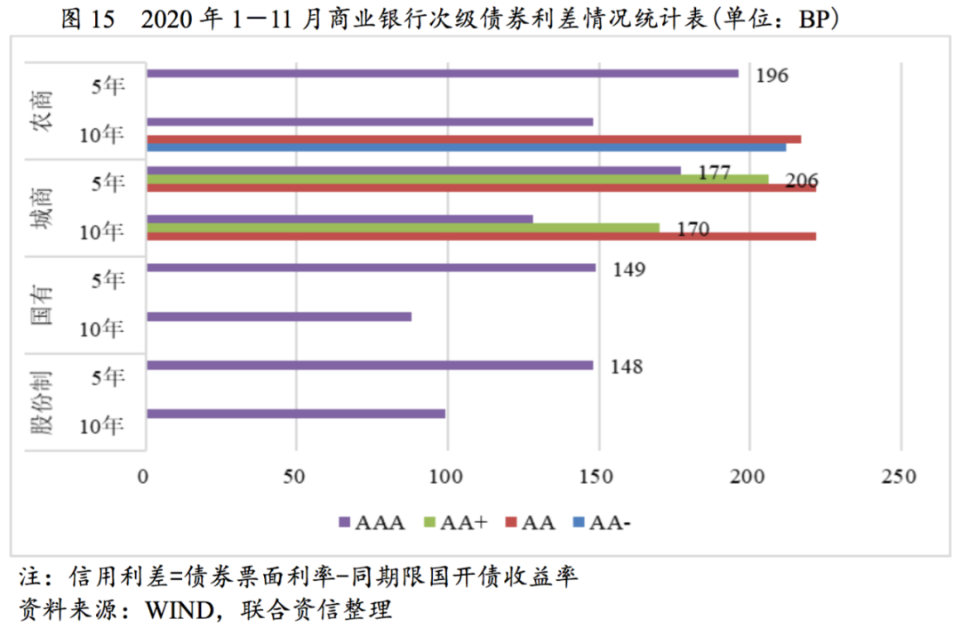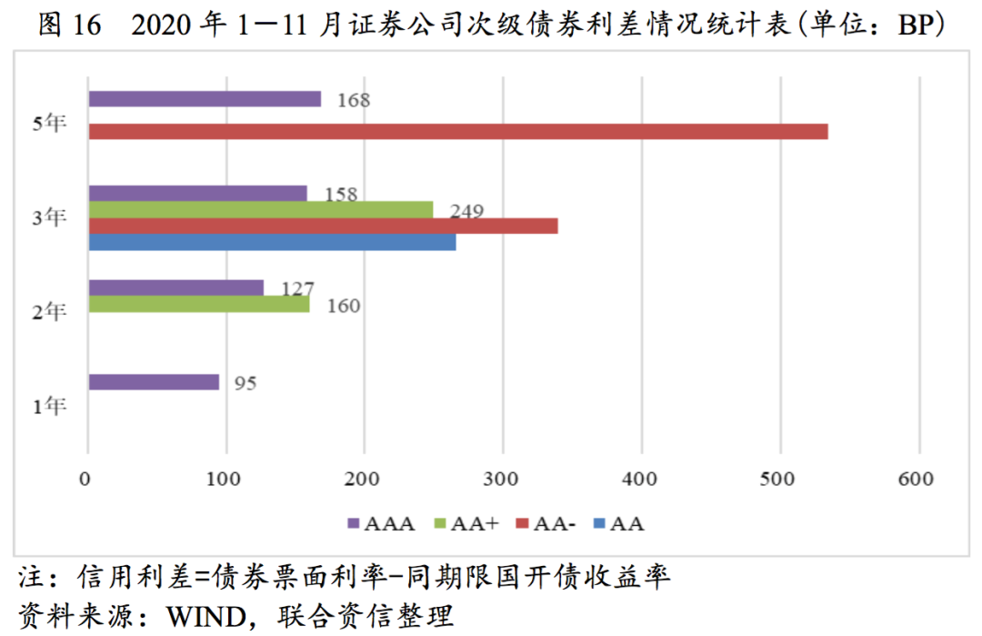 2020年1-11月,證券公司次級(jí)債發(fā)行期限1~5年,1年期次級(jí)債均為主體信用級(jí)別AAA級(jí)證券公司發(fā)行。兩年期次級(jí)債券AAA級(jí)證券公司信用利差低于AA+級(jí)33BP,3年期次級(jí)債券AAA級(jí)信用利差低于AA+級(jí)別91BP。5年期AA-主體信用級(jí)別樣本較少,個(gè)體差異化影響較大。通過(guò)商業(yè)銀行和證券公司發(fā)行次級(jí)債券信用利差對(duì)比,國(guó)有商業(yè)銀行和股份制商業(yè)銀行信用利差最低,商業(yè)銀行信用級(jí)別之間的利差低于證券公司,但5年期AAA級(jí)證券公司次級(jí)債券信用利差低于AAA級(jí)城商行和農(nóng)商行分別為8BP和28BP。