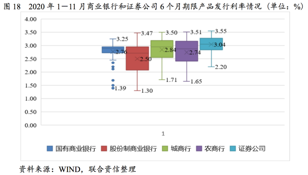 短期限產(chǎn)品中,股份制商業(yè)銀行利率均值最優(yōu),3個(gè)月期限產(chǎn)品證券公司發(fā)行利率均值優(yōu)于國(guó)有銀行、城商行和農(nóng)商行。6個(gè)月、9個(gè)月期限產(chǎn)品,證券公司與農(nóng)商行和城商行發(fā)行利率均值差距較小。