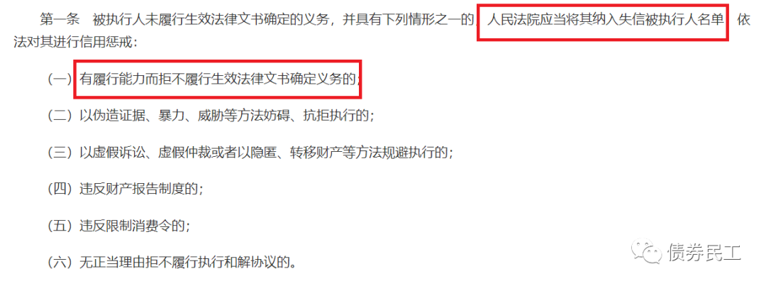 根據(jù)最高人民法院于2017年印發(fā)的《關(guān)于公布失信被執(zhí)行人名單信息的若干規(guī)定》,有履行能力而拒不履行生效法律文書確定義務(wù)、以偽造證據(jù)、暴力、威脅等方法妨礙、抗拒執(zhí)行的等六種情形需要納入失信被執(zhí)行人名單。根據(jù)評級公告的信息,這個城投公司屬于第一種類型,即“有履行能力而拒不履行生效法律文書確定義務(wù)”。