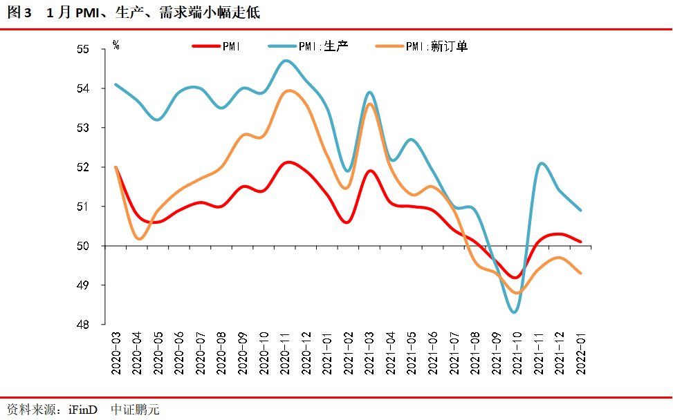 (一)PMI小幅下行,生產(chǎn)和需求有所走低,主要受1月季節(jié)性影響,但穩(wěn)增長的預(yù)期凸顯
