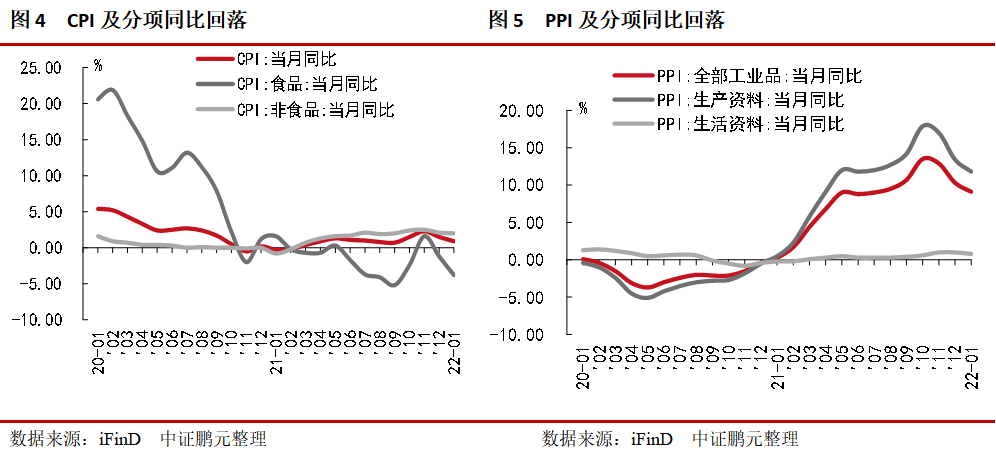 1月PPI同比上漲9.1%,漲幅比上月回落1.2個百分點。其中,生產(chǎn)資料價格上漲11.8%,漲幅回落1.6個百分點;生活資料價格上漲0.8%,漲幅回落1.6個百分點。從PPI環(huán)比來看,保供穩(wěn)價政策有力推進(jìn),煤炭、鋼材價格繼續(xù)回落,煤炭開采和洗選業(yè)價格下降3.5%,黑色金屬冶煉和壓延加工業(yè)價格下降1.9%。受國際原油價格回升影響,國內(nèi)石油相關(guān)行業(yè)價格回暖。石油和天然氣開采業(yè)價格由上月下降6.9%轉(zhuǎn)為上漲2.6%;化學(xué)原料和化學(xué)制品制造業(yè)、化學(xué)纖維制造業(yè)價格分別下降1.3%和0.1%,降幅比上月分別收窄0.8和3.0個百分點國際有色金屬價格上行,帶動國內(nèi)有色金屬冶煉和壓延加工業(yè)價格上漲0.8%。