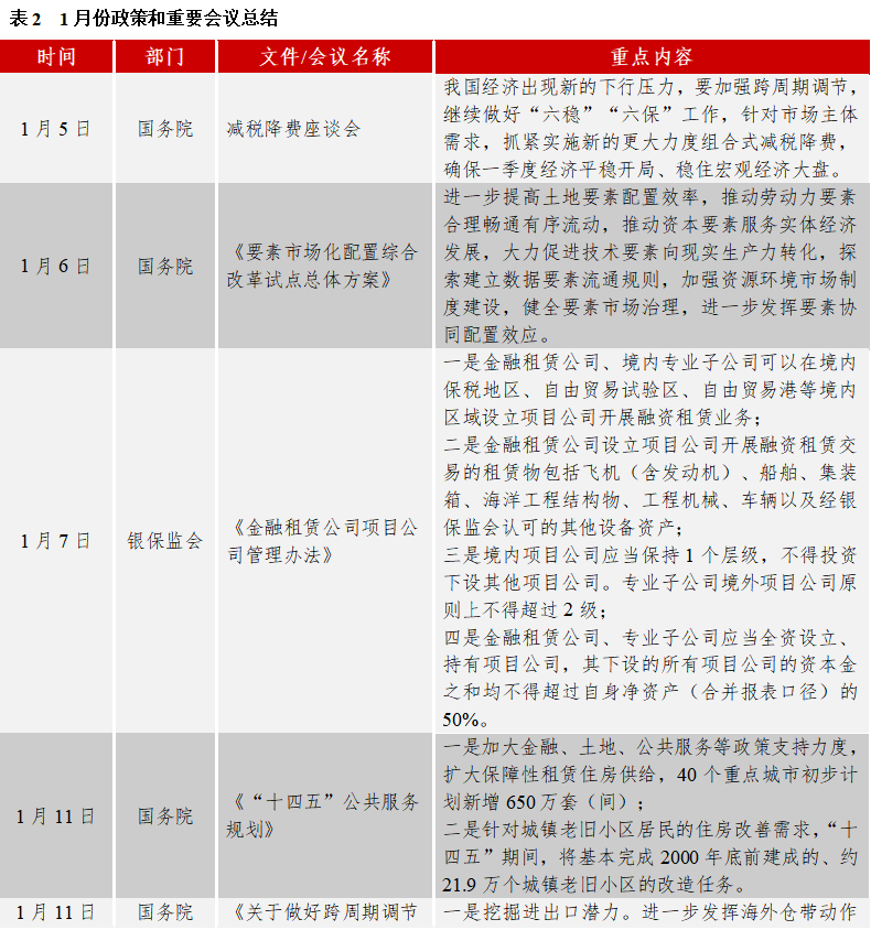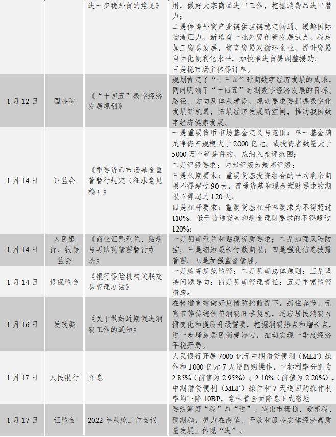債券市場制度建設(shè)方面:1月7日,銀保監(jiān)會下發(fā)《金融租賃公司項目公司管理辦法》,對金融租賃公司、境內(nèi)專業(yè)子公司開展融資租賃業(yè)務(wù)進(jìn)行了業(yè)務(wù)、范圍、結(jié)構(gòu)等方面要求和規(guī)范。1月14日,證監(jiān)會發(fā)布《重要貨幣市場基金監(jiān)管暫行規(guī)定(征求意見稿)》,定義與范圍,杠桿、久期等方面對重要貨幣基金進(jìn)行了要求。1月14日,人民銀行、銀保監(jiān)會發(fā)布《商業(yè)匯票承兌、貼現(xiàn)與再貼現(xiàn)管理暫行辦法》,一是明確承兌和貼現(xiàn)資質(zhì)要求;二是加強風(fēng)險防控;三是縮短最長付款期限;四是強化信息披露管理;五是加強監(jiān)督管理。1月17日,人民銀行開展7000億元中期借貸便利(MLF)操作和1000億元7天逆回購操作,操作利率均下降10BP,意味著全面降息正式落地。1月20日,住建部召開年度系統(tǒng)工作會議,要求一是加強房地產(chǎn)市場調(diào)控;二是推進(jìn)住房供給側(cè)結(jié)構(gòu)性改革;三是實施城市更新行動;四是實施鄉(xiāng)村建設(shè)行動;五是落實碳達(dá)峰碳中和目標(biāo)任務(wù);六是推動建筑業(yè)轉(zhuǎn)型升級等。1月26日,財政部發(fā)布《關(guān)于基礎(chǔ)設(shè)施領(lǐng)域不動產(chǎn)投資信托基金(REITs)試點稅收政策的公告》,對我國基礎(chǔ)設(shè)施REITs試點明確了相應(yīng)部分稅收政策,在資產(chǎn)重組和發(fā)行階段,減免和轉(zhuǎn)讓時遞延所得稅,這標(biāo)志著中國REITs稅收制度建設(shè)正式開啟,意義重大,公募REITs進(jìn)入快速發(fā)展階段。