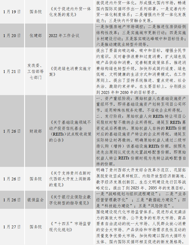 宏觀經(jīng)濟(jì)設(shè)計方面:1月6日,國務(wù)院印發(fā)了《要素市場化配置綜合改革試點總體方案》,要求加強資源環(huán)境市場制度建設(shè),健全要素市場治理,進(jìn)一步發(fā)揮要素協(xié)同配置效應(yīng)。本月出臺了一系列穩(wěn)增長的政策和措施:國務(wù)院分別印發(fā)了《關(guān)于做好跨周期調(diào)節(jié)進(jìn)一步穩(wěn)外貿(mào)的意見》、《關(guān)于促進(jìn)內(nèi)外貿(mào)一體化發(fā)展的意見》,對我國外貿(mào)進(jìn)一步發(fā)展提出要求;發(fā)改委聯(lián)合相關(guān)部門分別印發(fā)了《關(guān)于做好近期促進(jìn)消費工作的通知》、《促進(jìn)綠色消費實施方案》,對促進(jìn)消費和綠色消費的措施進(jìn)行了明確。1月,國務(wù)院分別印發(fā)了多份“十四五”發(fā)展規(guī)劃:《“十四五”數(shù)字經(jīng)濟(jì)發(fā)展規(guī)劃》、《“十四五”公共服務(wù)規(guī)劃》、《“十四五”市場監(jiān)管現(xiàn)代化規(guī)劃》、《關(guān)于支持貴州在新時代西部大開發(fā)上闖新路的意見》。